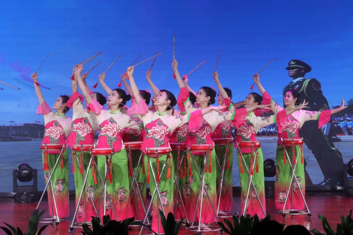 演出在歌舞《花鼓·源》中拉開帷幕,國家級非物質(zhì)文化遺產(chǎn)項目鳳陽花鼓唯一代表性傳承人孫鳳城和學(xué)生們一起登臺演出,歡快的鼓點和靈動優(yōu)美的舞姿瞬間引爆了全場。