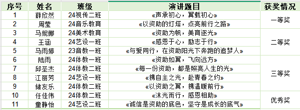 選手們的演講時而激昂澎湃,時而溫情脈脈,每一個故事都緊扣“資助”與“熱愛”的主題,既展現(xiàn)了受助學子在政策關(guān)懷下不畏困難、奮勇前行的精神風貌,也傳遞出“感恩于心、勵志于行、傳遞溫暖”的價值追求,現(xiàn)場不時響起陣陣熱烈掌聲。經(jīng)過評委從內(nèi)容主題、語言表達、情感傳遞、臺風儀表等維度的綜合評審,最終評選出一等獎2名、二等獎3名、三等獎4名及優(yōu)秀獎2名。具體名單如下: