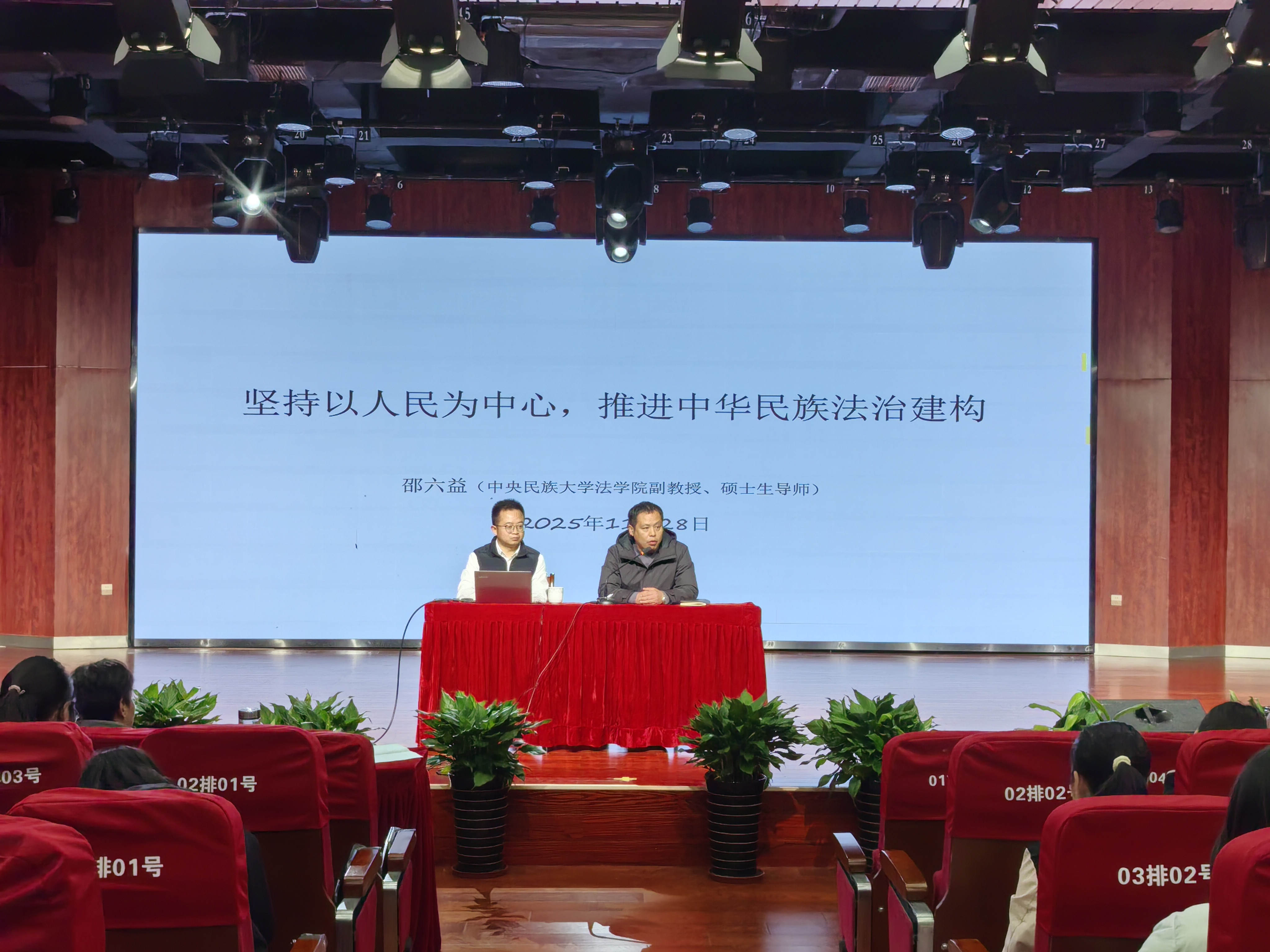 為深入學習貫徹習近平法治思想,推進筑牢中華民族共同體意識教育,11月28日,學校組織開展"堅持以人民為中心,推進中華民族法治建構(gòu)"專題講座。各部門的黨員干部、思政課教師以及150名學生代表參加報告會,共同感悟法治思想的真理力量與為民溫度。
