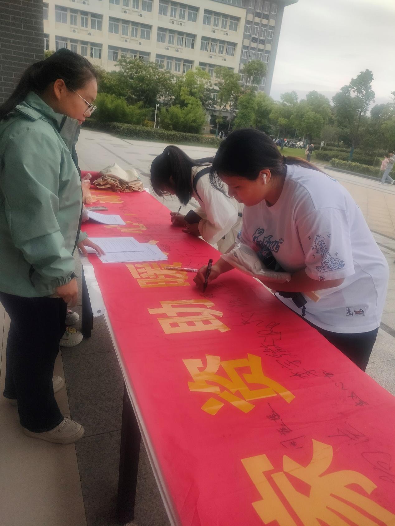 “言必誠(chéng)信,行必忠正”,誠(chéng)信是中華民族的傳統(tǒng)美德,也是社會(huì)主義核心價(jià)值觀的重要內(nèi)容,更是大學(xué)生立身做人、成長(zhǎng)成才的必備素養(yǎng)。為進(jìn)一步提高我系學(xué)生的誠(chéng)信意識(shí),培養(yǎng)誠(chéng)信品質(zhì),構(gòu)建誠(chéng)實(shí)守信的校園文化,發(fā)揮資助育人功能,強(qiáng)化資助育人效果,我系于6月5日下午在食堂門口開展了誠(chéng)信資助橫幅簽字活動(dòng),同日課間及晚自習(xí)開展了資助誠(chéng)信承諾書簽訂活動(dòng)。