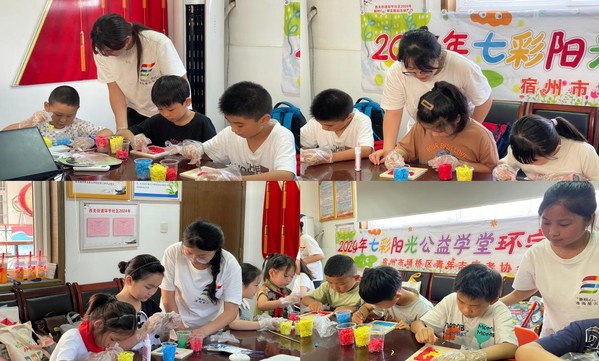 在課堂上團(tuán)隊(duì)成員融合當(dāng)?shù)貪夂竦母锩幕?,將“紅色”帶到課堂來。尤其是作為師范專業(yè)的他們,結(jié)合自身專業(yè),同時(shí)積極響應(yīng)國家政策文件,開展了講故事、演故事、唱隊(duì)歌等多樣化、綜合化的教學(xué),讓孩子們由內(nèi)而外對(duì)革命先輩充滿敬畏! 03學(xué)做紙漿畫,傳遞愛國情 紙漿畫,起源于中國傳統(tǒng)的手工藝,是古老造紙術(shù)與現(xiàn)代繪畫技藝的巧妙結(jié)合體,體現(xiàn)了人們對(duì)廢棄物再利用的環(huán)保意識(shí)和對(duì)美的追求。我?!氨┬模瑐骷t心”淮海星火實(shí)踐團(tuán)在埇橋區(qū)青年志愿者協(xié)會(huì)七彩陽光公益學(xué)堂環(huán)宇社區(qū)教學(xué)點(diǎn)開展了“學(xué)做紙漿畫,傳遞愛國情”主題課程。
