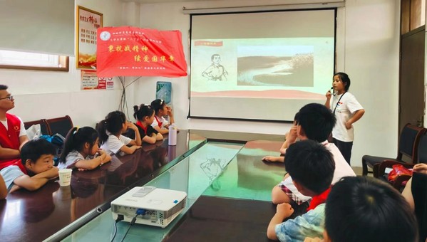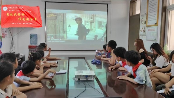 課堂上,團(tuán)隊(duì)成員帶著孩子們觀看了《逃出大英博物館》等視頻,“中國人,從不干偷雞摸狗的事!”孩子們也主動(dòng)分享著自己的感悟,這堂課不僅豐富了孩子們的歷史知識(shí),更激發(fā)了他們的愛國熱情。 02講紅色故事,傳抗戰(zhàn)精神 “要讓紅色文化滲透到我們生活的每一處,尤其是學(xué)生們,我們更應(yīng)該結(jié)合地方資源開展豐富多彩的課堂?!边@是團(tuán)隊(duì)成員們交流總結(jié)出來的。事實(shí)上,他們也真的這么做了。我?!氨┬?,傳紅心”淮海星火實(shí)踐團(tuán)在埇橋區(qū)青年志愿者協(xié)會(huì)七彩陽光公益學(xué)堂環(huán)宇社區(qū)教學(xué)點(diǎn)開展了“講紅色故事,傳抗戰(zhàn)精神”主題課程。
