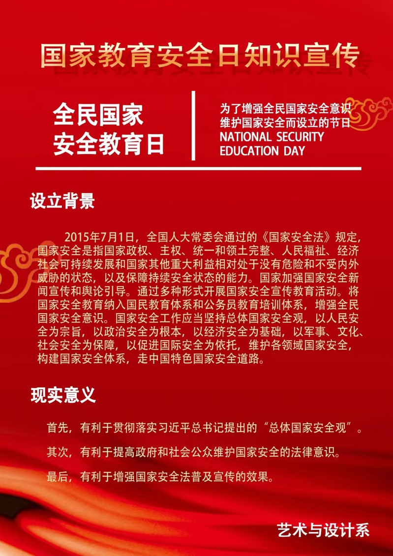 在第七個全民國家安全教育日到來之際,根據(jù)學校統(tǒng)一部署,結合我系實際,為進一步提高同學們的國家安全意識和法治意識,藝術與設計系于2022年4月份舉辦了“國家安全教育日”主題思政系列活動。